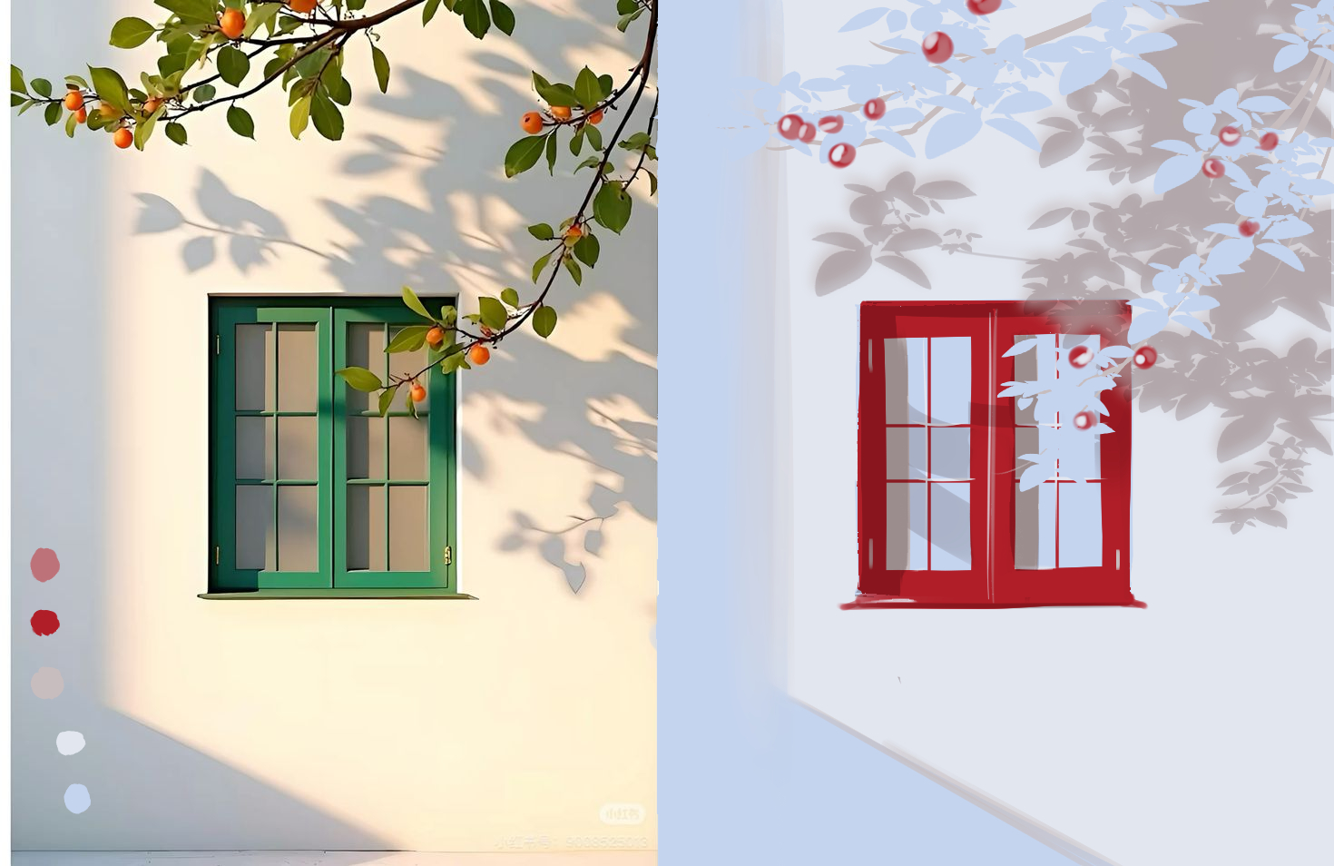 그래서, 창문 사진은 채도 대비에 해당한다고 파악했다. 주로 채도가 낮은 무채색에 가까운 색상들 속에 창문과 열매만을 붉은색으로 표현해 이 둘을 강조하고자 했으니 말이다. 원본 사진과 내가 바꾼 색깔들의 속성을 파악해 봤을 때 모두 저명도에 해당한다고 생각했다. 모두 잿빛이 섞인 흐릿한 느낌이 있어서 고명도처럼 보이지는 않았다.