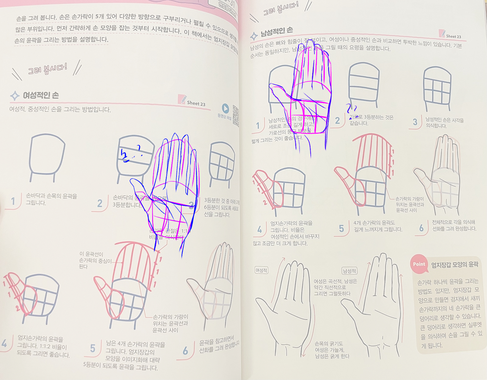 자 이제 사람의 전체적인 특징은 계속 연습하고 있으니 부위별로 뜯어서 연습하고 싶었다. 그래서 미루고 미루던, 어떻게든 외면했던 손에 도전해 보기로 했다. 내 선생님이 준 손 자료를 연습해 보고 이게 생각보다 할 만 하기에 그럼 튜토리얼을 시도하는 건 쉽게 되겠군! 했으나 오히려 더 마음에 들지 않았다. 어딘가 내가 원하는 이상적인 손과는 조금씩 느낌이 달랐던 것이다. 분명 옆에 정답지도 있는데 왜... 예쁘게 잘 안 나오지? 의문이 들었다.