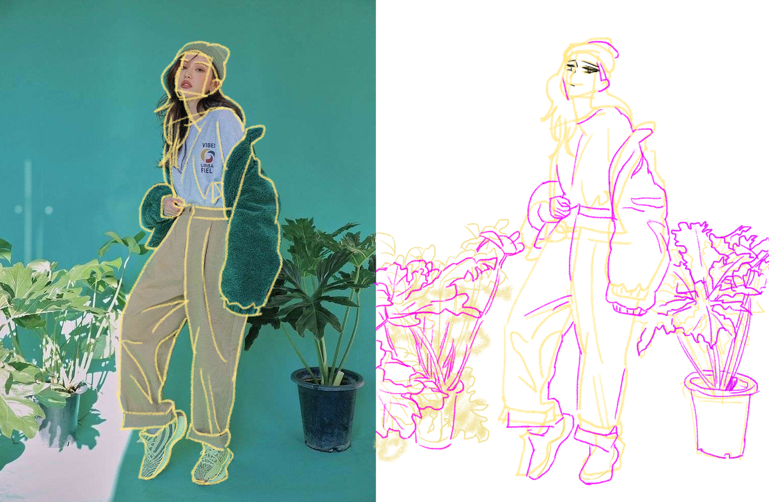 이건 옷에 팔다리들이 감춰져 있어서 그걸 파악하기 조금 어려웠지만 그냥 눈에 보이는 대로 그려버리자 마음먹자 난이도는 줄어들었다. 내가 인체를 파악하고자 했다면 누드 크로키를 했을 테니까. 지금 나는 옷 그리는 법이 알고 싶었던 거니까 그래서 눈에 보이는 곳에 집중했다.