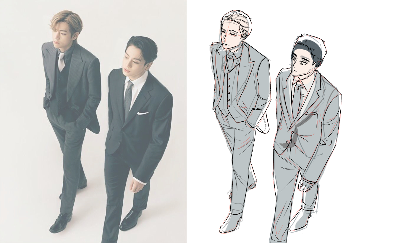 모델이 꽤 잘 생겼길래 들고왔는데 계속 분석하면서 얼굴을 보다 보니 어디서 많이 본 얼굴인 것이다. 그렇다. 방탄소년단 멤버였다. 나는 몰랐지. 그냥 둘이 풀어헤친 정장+금발에 단정하게 단추를 잠근+흑발이길래 '내스급' '성현제'랑 '송태원' 하이 앵글 연습하기 최적이다! 하고 들고 왔더니. 하지만 개인적으로는 대차게 말아먹은 느낌이다.