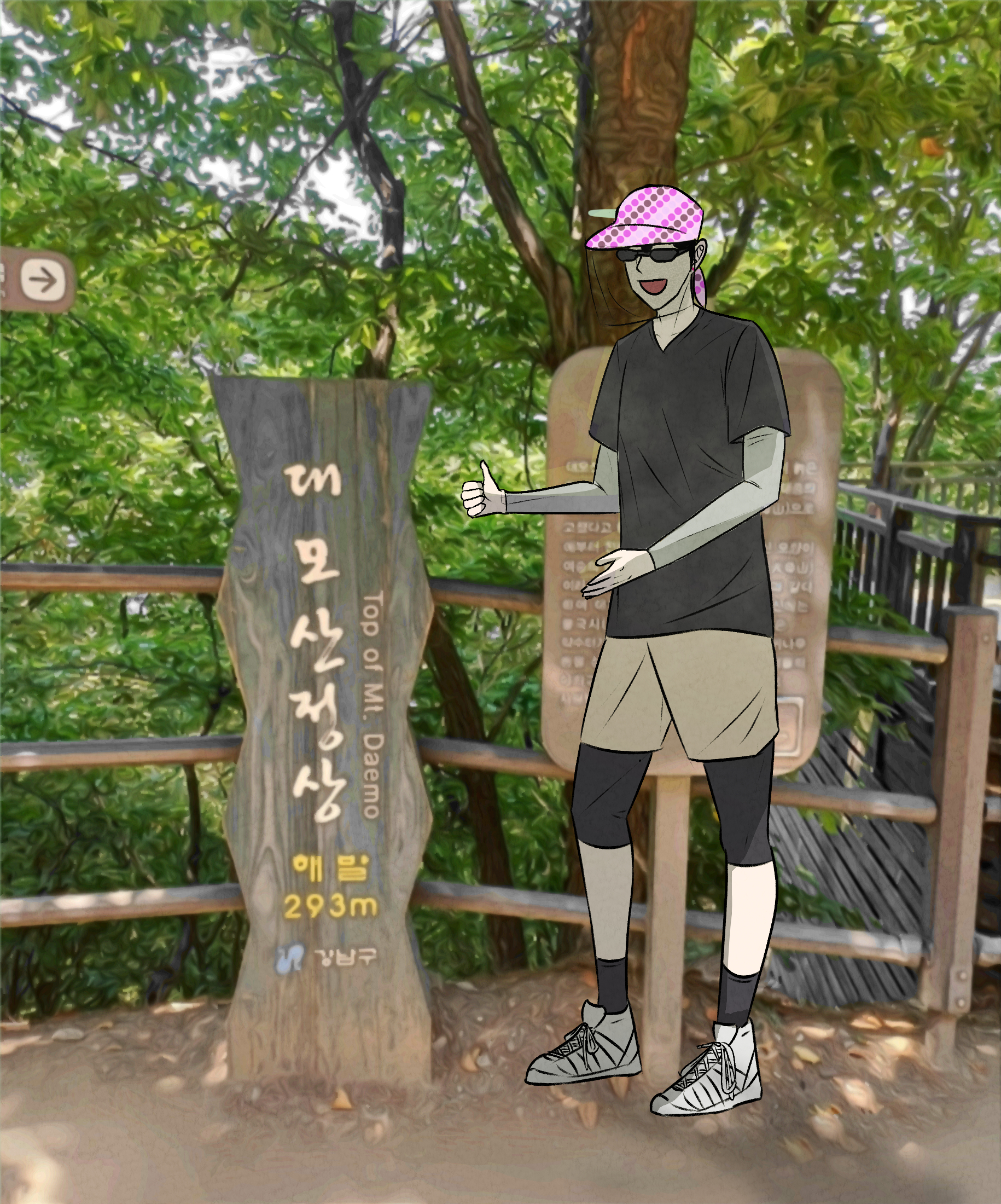 이걸 시도할 때 대모산 정상을 검색해 캐릭터를 세워둘 수 있는, 최대한 그냥 정자세로 세워놔도 투시에 어려움이 없는 평탄한 배경 사진을 구하는 게 우선이었다. '왜 하필 대모산이었냐' 한다면 작중 등장하는 '해연 길드'의 위치가 서울 법원과 가까이 있다는 서술이 있어 운동을 간다면 가까운 산이 좋지 않겠나 싶어 서울 법원 근처 산을 검색해 찾아냈다. 나름 작품에 몰입하고 싶었다.
