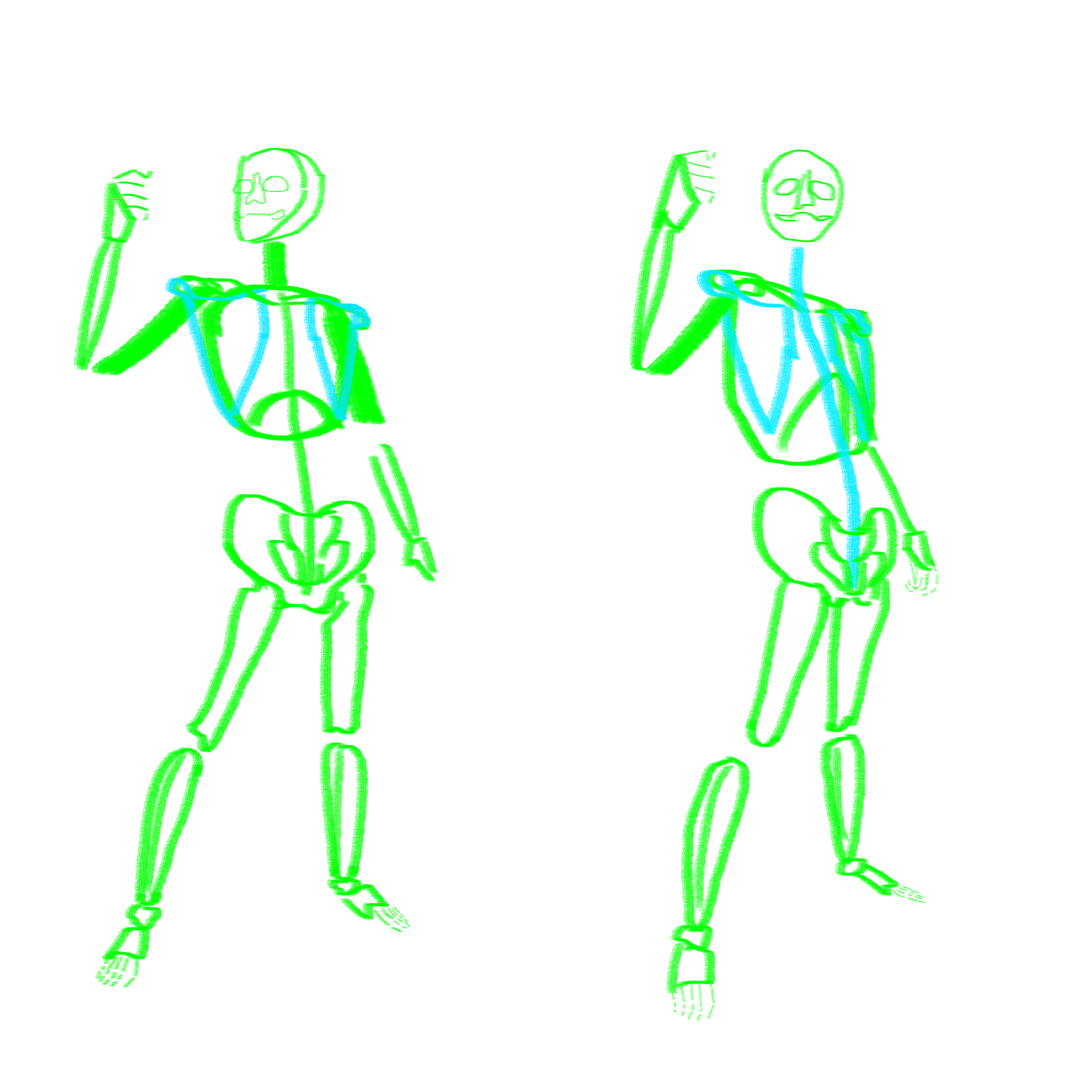 그래서 종이에 크로키를 하면 틀리든 말든 거침없이 선을 긋는 건 가능하니까 종이에 크로키를 주로 하고 있고 디지털로는 모작, 창작, 응용 위주로 연습하는 용도로 쓰고 있다. 그리고 최근 들었던 콜로소 강의에서는 제스처 드로잉 시 '흐름'이라는 부분을 배우면서 억지로 사람을 그리려고 하지 않아도 (링크)의 예시처럼 흐름만 툭툭 그려줘도 대략적인 형태는 만들어지기에 그 부분을 유념하며 적용하려 하고 있다.