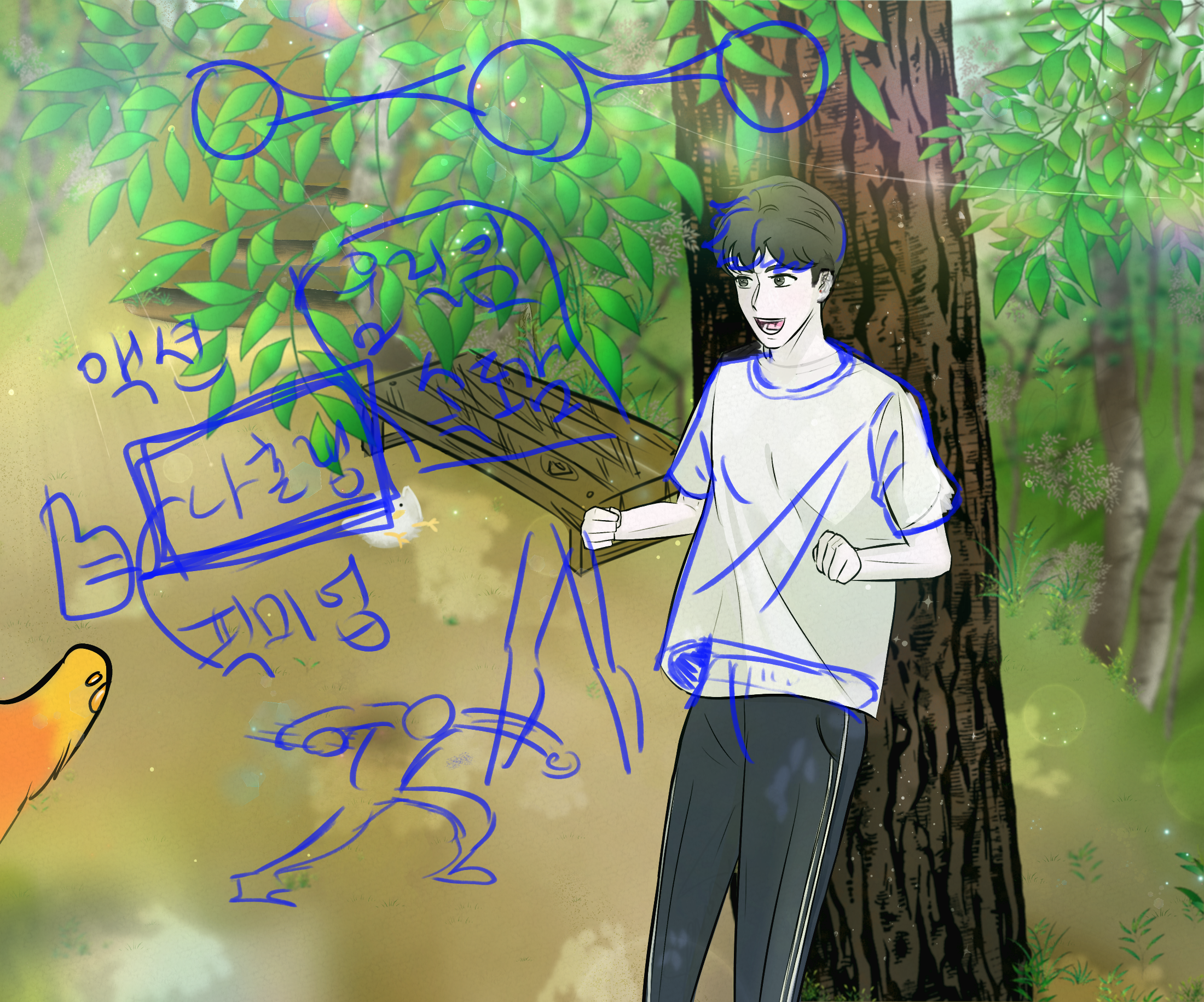 처음에는 나무 쪽 배경에는 온통 초록빛으로 채색했었는데, 오른쪽 위 귀퉁이에는 하늘색을 칠해 저 부근은 하늘이 보이는 것처럼 만들었다. 다음엔 입체감을 조금 더 심어주기 위해 인물이 등치기를 하고 있는 가장 큰 나무에 아름드리나무처럼 축 늘어진 이파리를 소재를 사용해 크게 넣어준 뒤 그 나뭇잎들에게도 볕뉘를 입혀주었다.