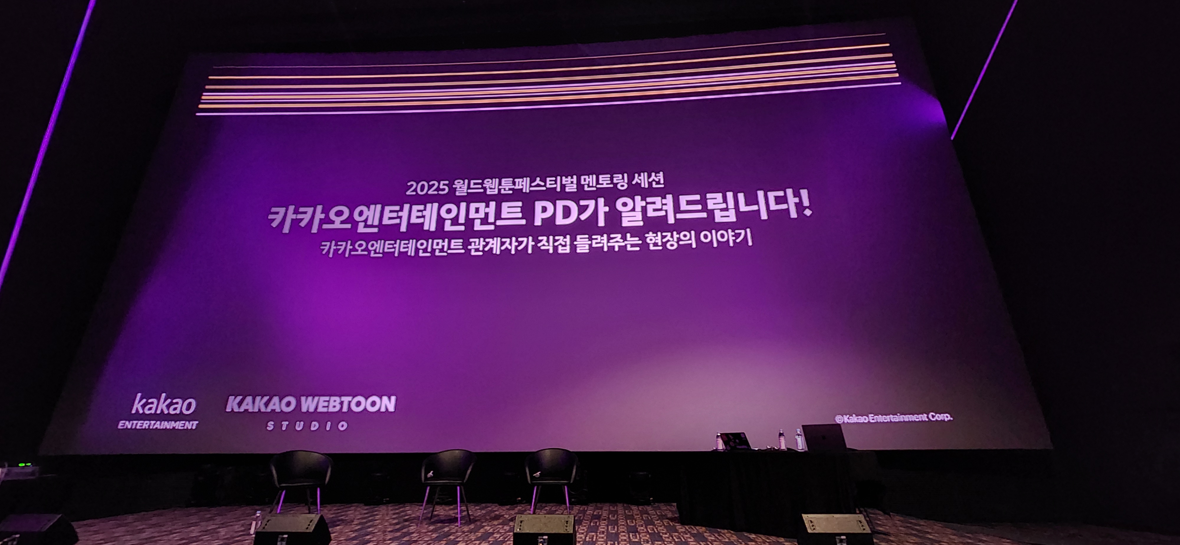 '카카오엔터테인먼트 PD가 알려드립니다!' 세션. 현직자의 이야기를 듣는다는 건 어떤 콘텐츠로든 소중한 일이었기에 방문 일자를 변경하게 만든 주원인이다. 작가들을 위한 구성이기는 했으나 잘 들어보면 결국 PD가 하는 일을 작가 기준에서 얘기를 해주고 있으니 PD 취준생에게도 정보를 얻기 유익한 세션이었다. 정말 아쉬운 점은 지연 관객을 기다리느라 귀중한 10분이 날아갔다는 점이었다. 나는 지연된 만큼 보충되겠지 했는데 뒤에도 세션이 있어 그건 불가했다.