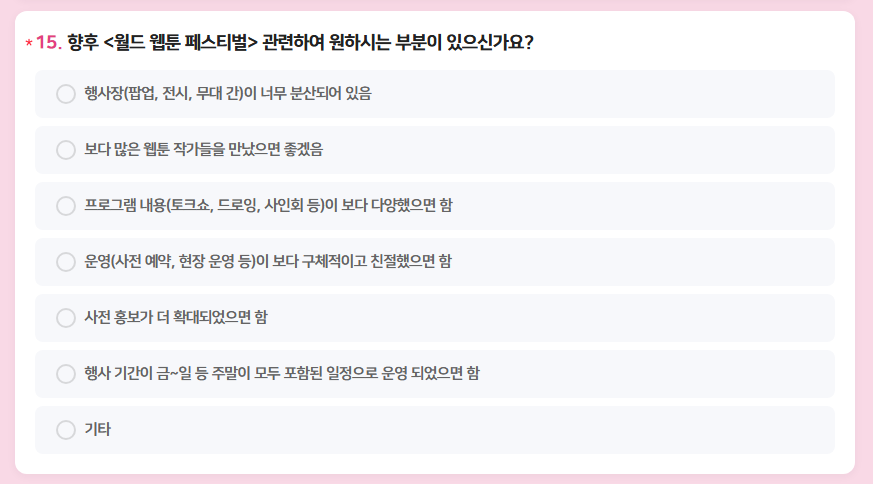 첫 번째 항목이 '행사장(팝업, 전시, 무대 간)이 너무 분산되어 있음'인 것을 보니 본인들도 무엇이 잘못됐는지 잘 알고 있는 것 같다.