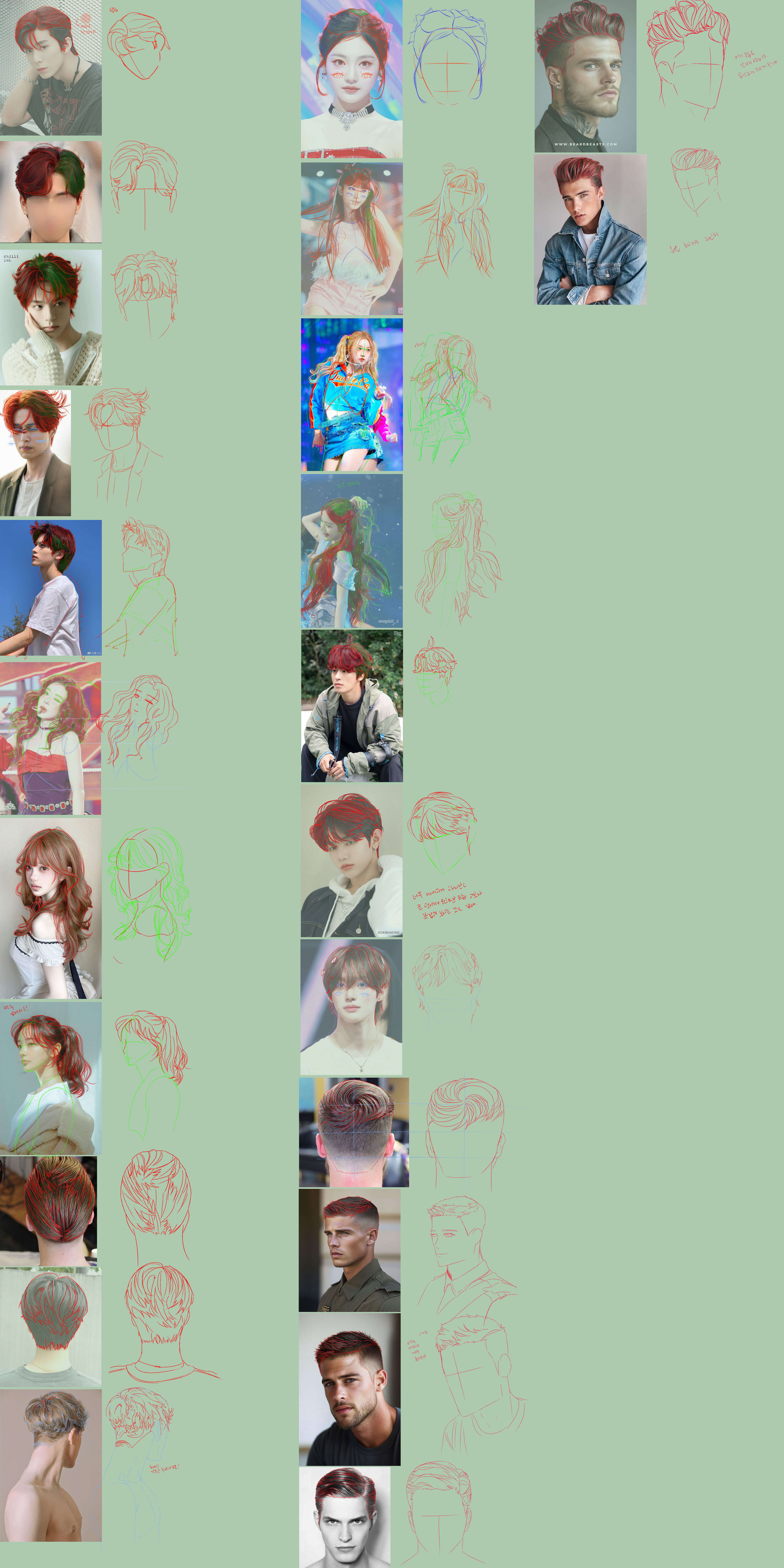 머리카락이 이렇게... 어려운 것이었나 싶은 연습이었다. 사실 이것만으로 모두 파악했다고 하기엔 무리가 있으니 나중에 한 번 더 시도해야 할 것 같다. 짧은 머리 3, 긴 머리 3, 곱슬머리 3, 뒤통수 3, 흩날리는 머리카락 3 정도로 나눠도 벌써 15개니 자료를 잘 골라봐야겠다.