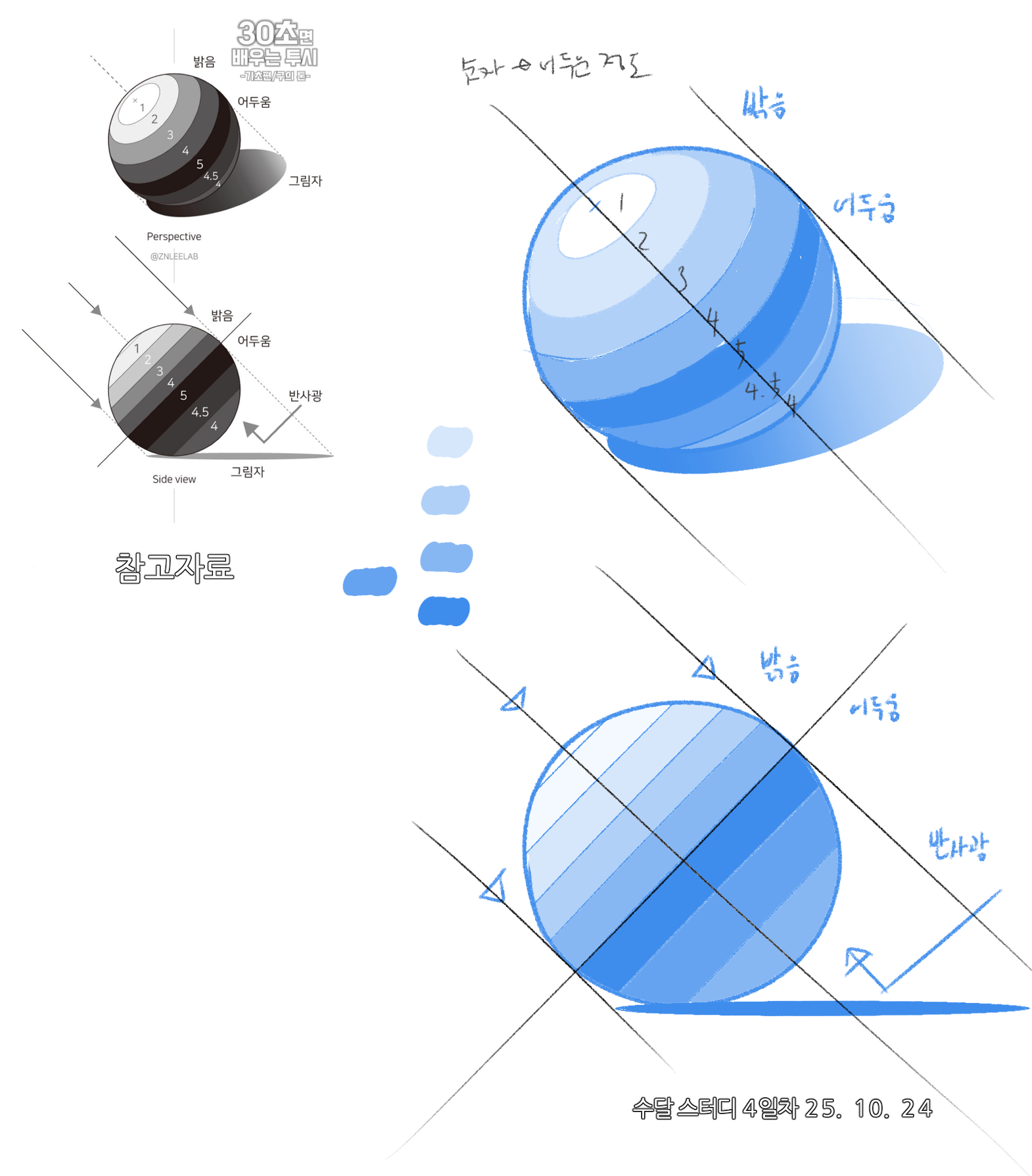 그리고 이왕 구체를 그려보는 김에 항상 도전해보고 싶었던 구의 빛과 그림자를 시도해보기로 했다. 깨달은 점은 빛과 그림자는 생각보다 더 세세하게 나눠져 있다는 부분이었다. 내가 채색을 시도할 때 많아봐야 세 가지 정도로만 나눠둬서 이렇게 많이 나눠질 거라 생각하지 못했는데, 역시 사람은 공부를 해야 한다.
