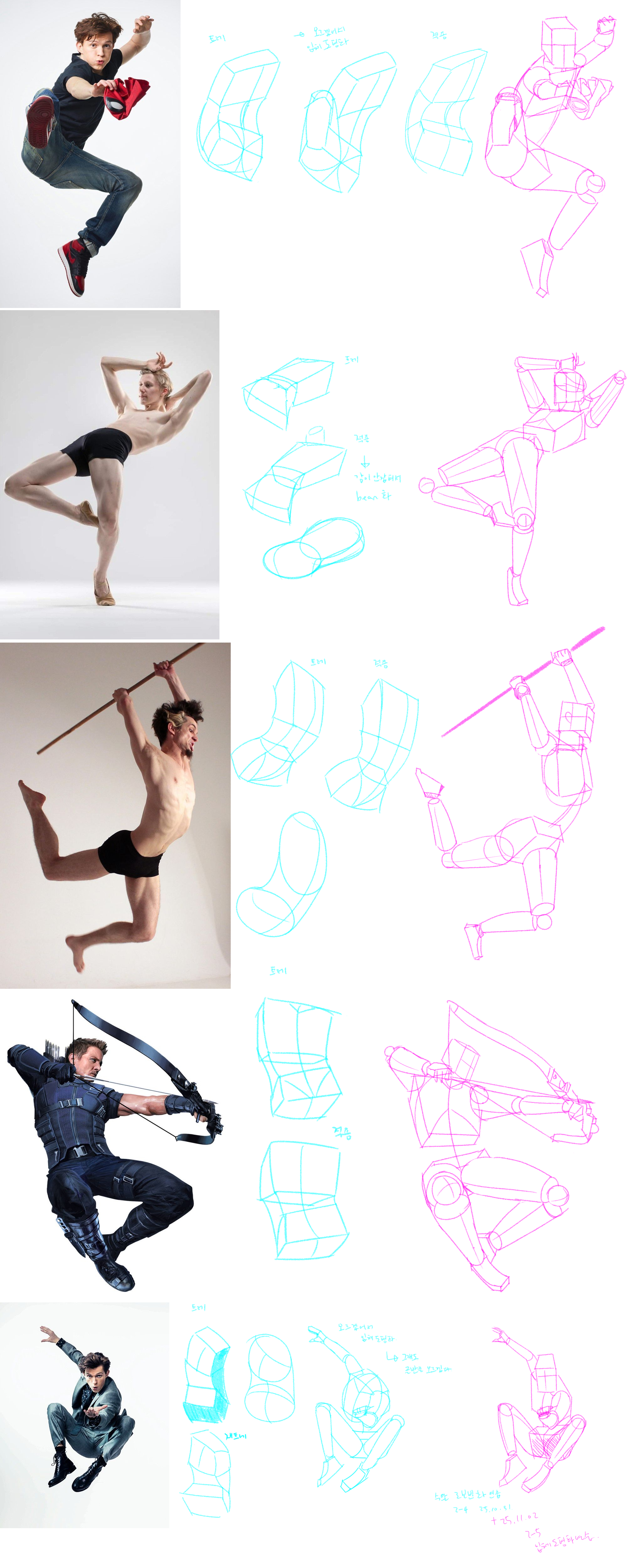이런 식으로 인체를 입체화 시켜나가는 과정인데, 처음에는 그게 좀 어려워서 헤매느라 박스 도형화 먼저 도전해 봤고 다음날 이런저런 방법을 동원해 파악하려 노력했다. 문제는 이렇게 해도 이 점프하는 자세들은 다리가, 골반이 허리가 도대체 어떻게 되어있는지 알아내기가 힘들어 결국 다음에 박스 도형화로 되돌아갔다.